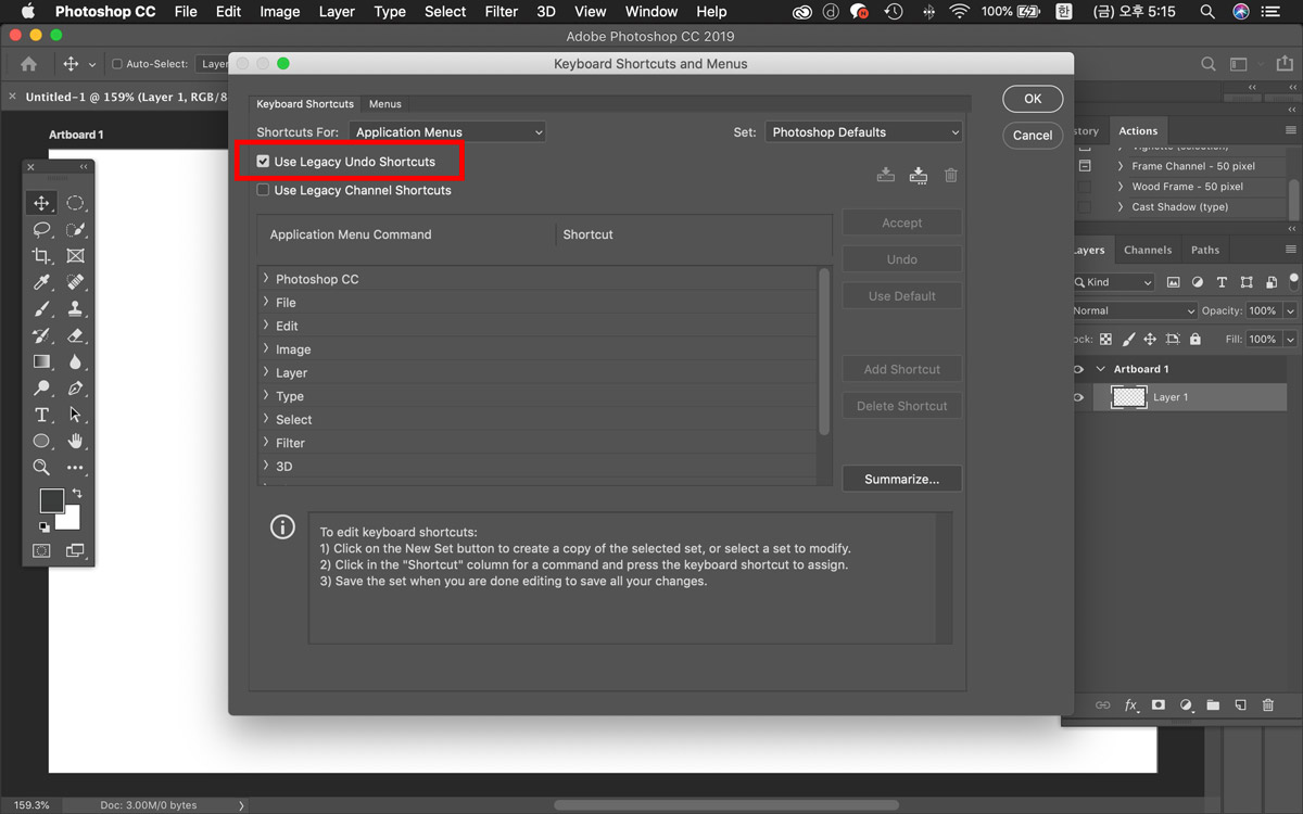 use legacy undo shortcuts의 체크박스를 클릭합니다.
